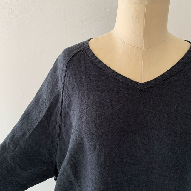 フロント、首元がスッキリと見えるキレイな開きのVネックチェクニック。